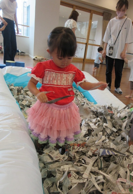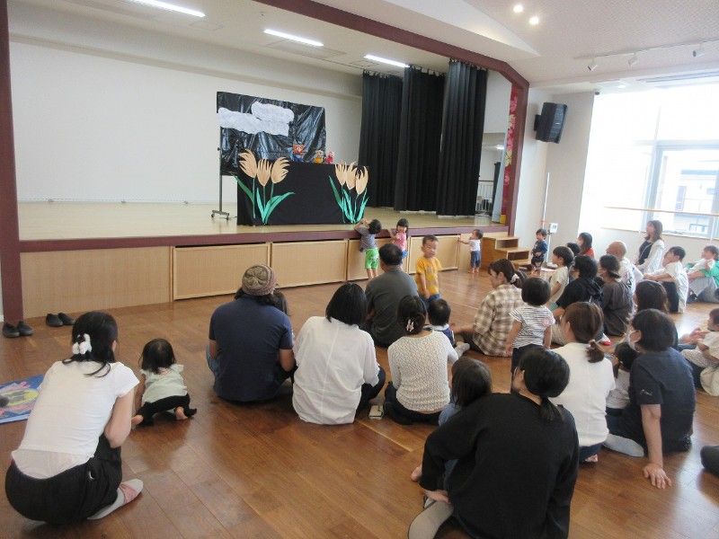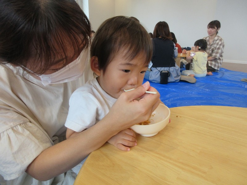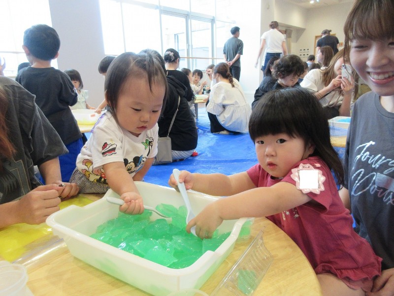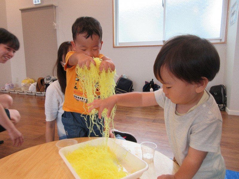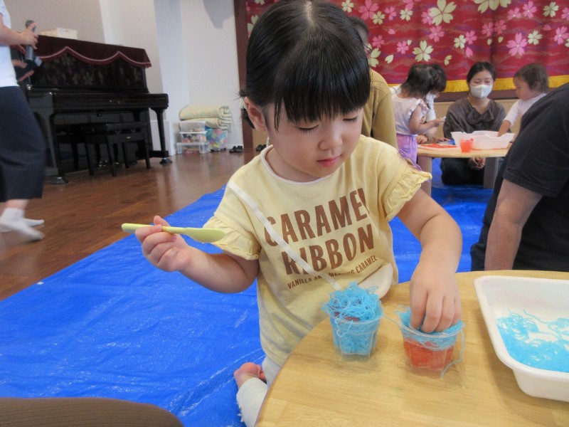 今回は「感触遊び」!食紅で色を付けた寒天やはるさめ、スライムなどを触ったり透明カップに入れてゼリーに見立てて遊んだり、思い思いに遊びました。寒天の冷たい感触にみんな大喜び!楽しそうに遊んでいました。その後は、「お月見」の人形劇を見て、マカロニきなこを食べました。