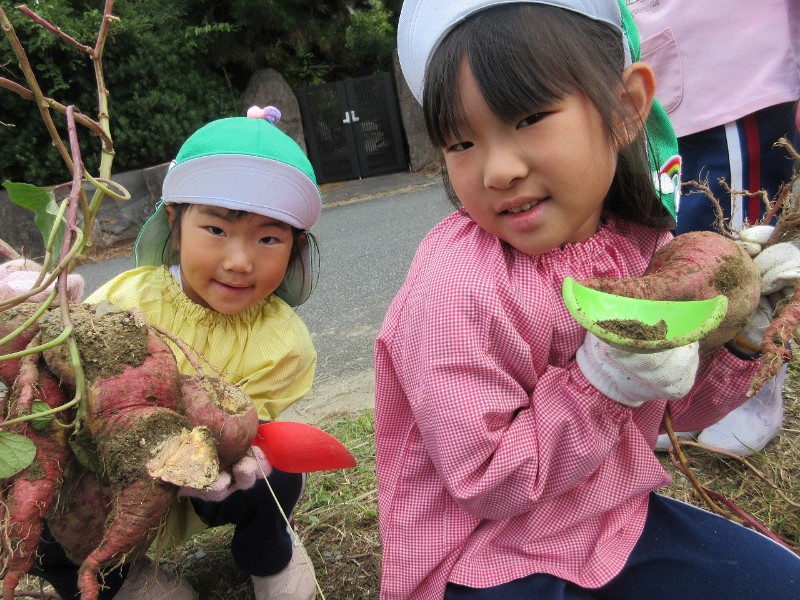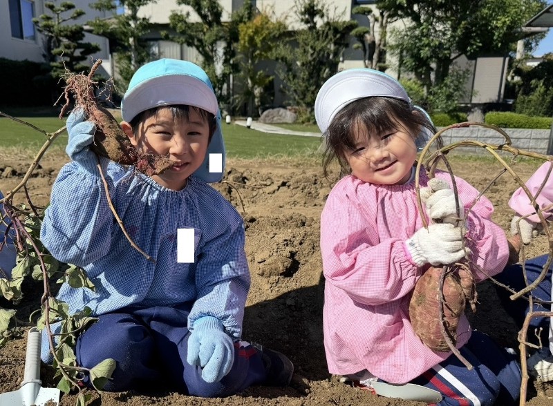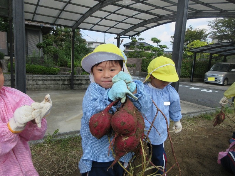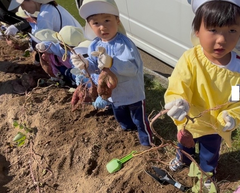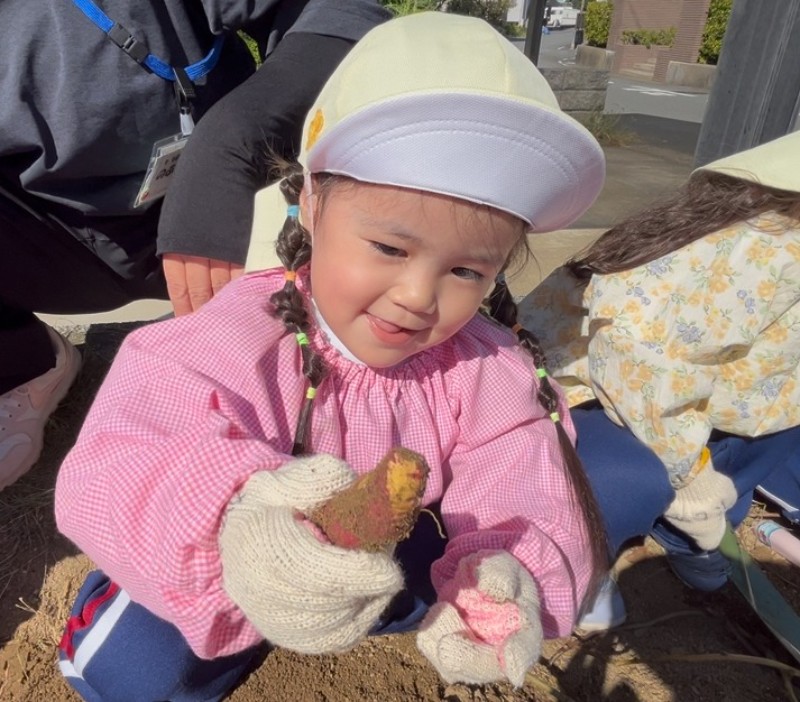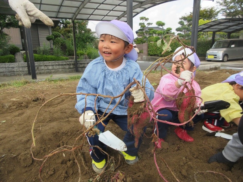 根が深く、なかなか掘れないお芋を友だちと声を掛け合いながら協力して掘り進める姿や、掘ったお芋を友だちや先生に見せ、「大きいの取れた!」「小さいのが繋がってる!」と喜び合う姿も見られました☺
