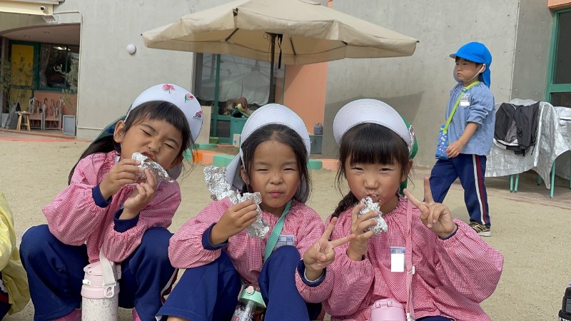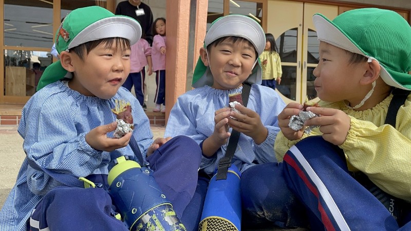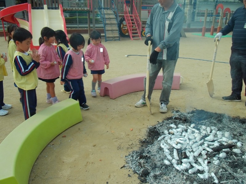 みんなで育てたお芋をアルミホイルで包みもくもくと煙が立つたき火の中へそっと入れました。「おいしくなぁ~れ!」とパワーを送った後は「やきいもグーチーパー」を歌ったり、お芋クイズをしたりして焼けるのを待ちました。少し冷めるのを待ってから食べましたが、お芋の中はまだアツアツ。「あちっ!」でも「おいしい!」もっと「おかわり!」等々。園庭はおいしい笑顔でいっぱいになりました。