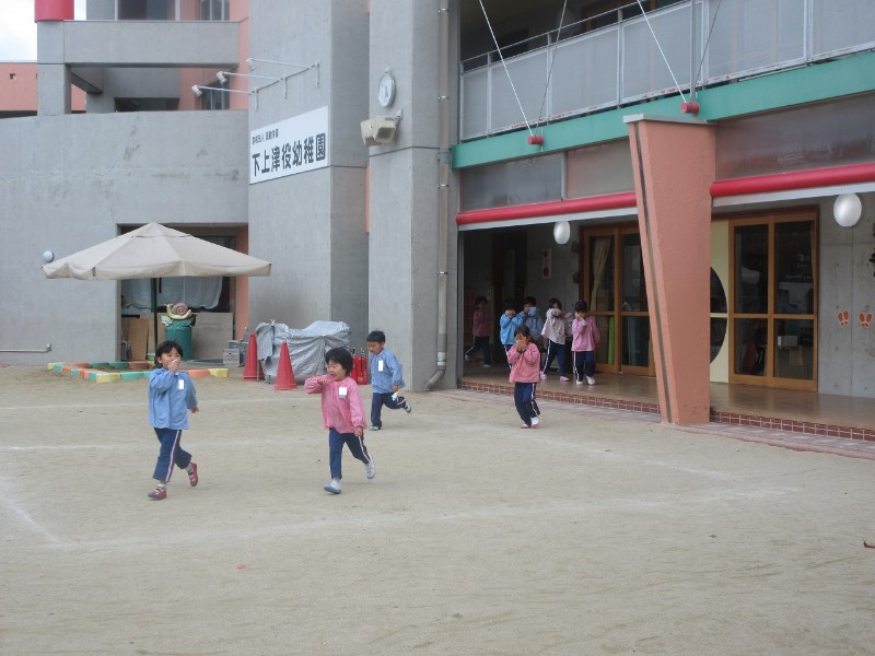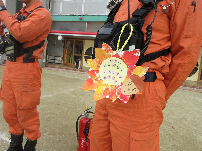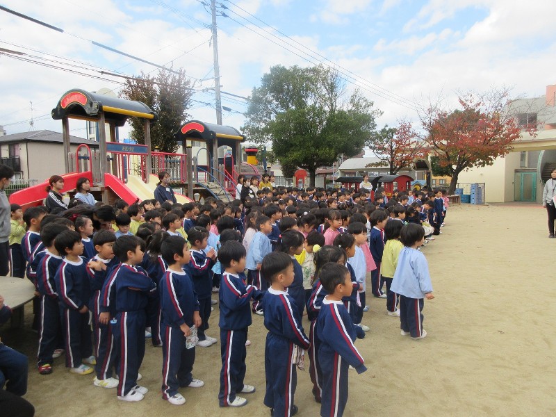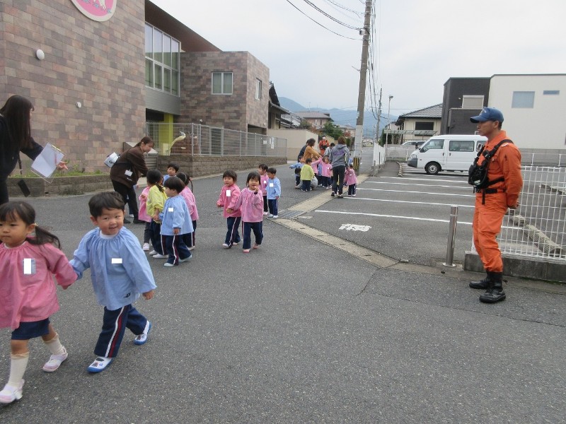 11月26日に満3歳児、28日に年少・年中・年長組の地震火災避難訓練がありました。地震発生時では揺れを感じたら机の下に隠れ「だんごむしポーズ」をして頭を守ったり、火災発生時ではタオルやハンカチで鼻と口を覆い、落ち着いて避難することが出来ました。