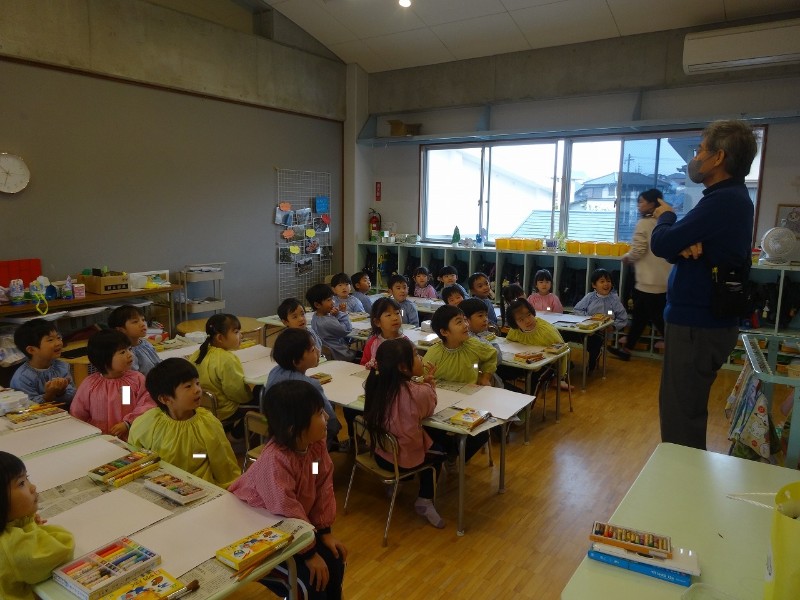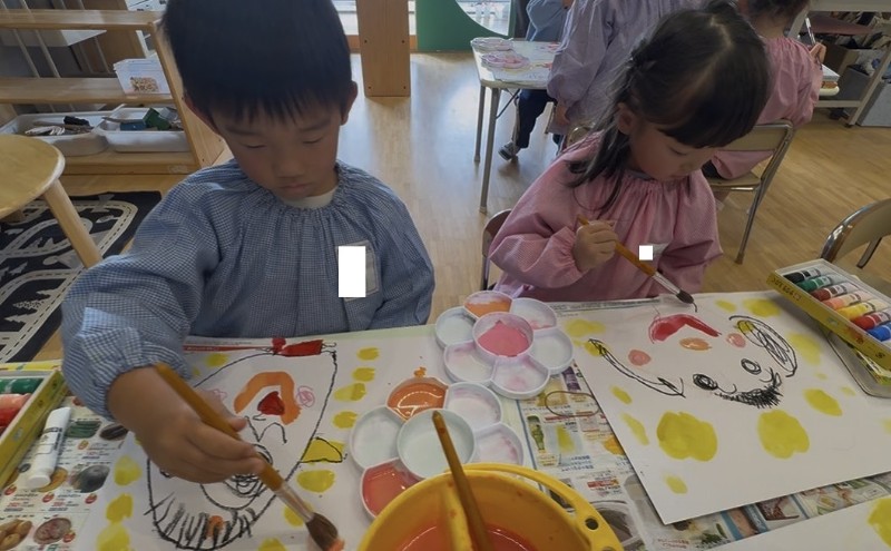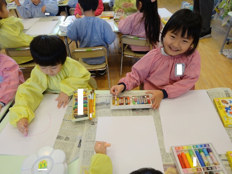 12月8日(月)に年中組さんはアトリエ教室に参加しました!今回は自分の顔をクレパスと絵の具で描くことに挑戦しました。始まる前に「僕の髪は何色だろう?」「私の耳はどこについているかな?」と鏡で確認した後、アトリエの先生と一緒に描き進めていました。絵の具では色の混ぜ合わせに興味がある様でした。ピンクと黄色を混ぜると薄橙色が出来ることを初めて知った子どもたち。さっそく試していましたよ。一人一人違う素敵な自画像が完成しました!