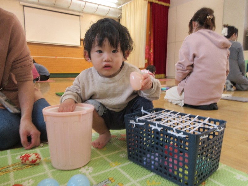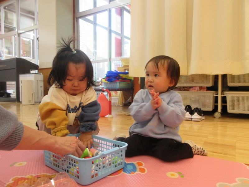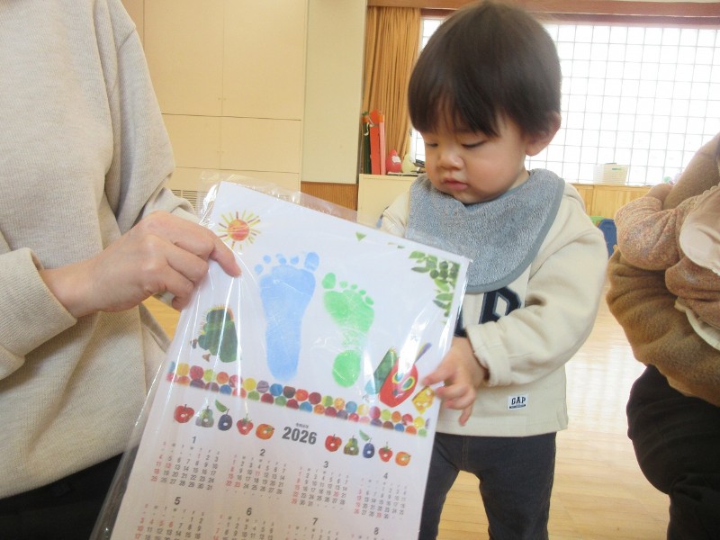 コーナー遊びでは、身近な物で簡単に作れるおもちゃで指先を使い上手に遊んだり、はらぺこあおむしのカレンダー製作も行いました。可愛い足型のカレンダー、是非お家に飾ってくださいね☆