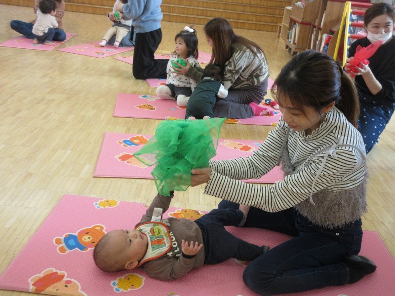 わらべうた遊びをしたり、カラフルなフラーフを使い歌に合わせて揺らしたり親子でたくさん触れ合い、子どもたちと心安らぐ時間を過ごしました。