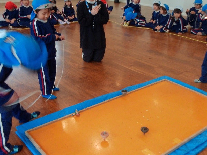 年中組さんでコマをもらった時から練習に励み、子どもたちはずっと楽しみにしていました。色を塗ったり絵を描いたりし、「こまにパワーためてきた!」「色付けたら強くなるんよ!」と張り切って本番を迎えました。